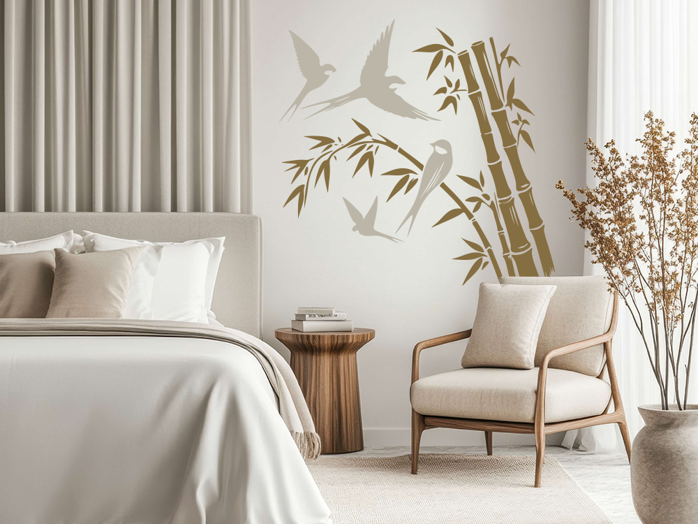 Das bunte Wandtattoo mit Bambus und Vögeln sorgt für natürliche Harmonie und ein entspanntes Raumgefühl