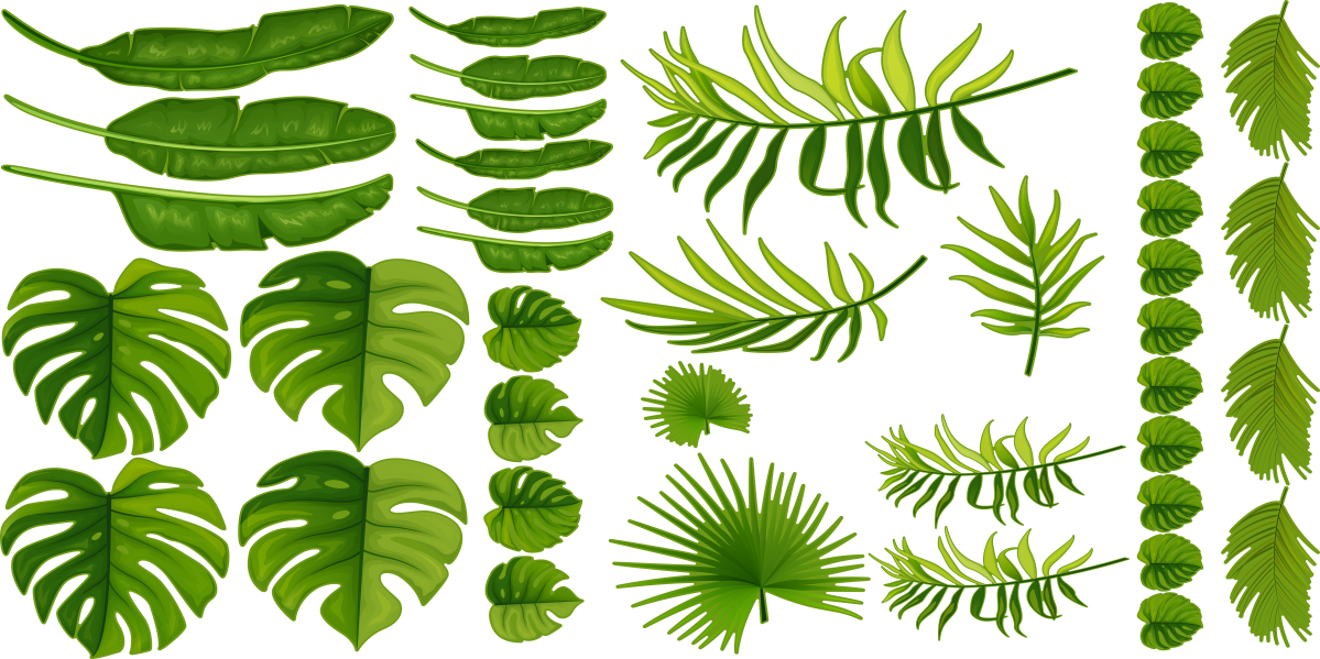 Blätter verschiedener Grünpflanzen wie beispielsweise Palmen, Farn oder Monstera